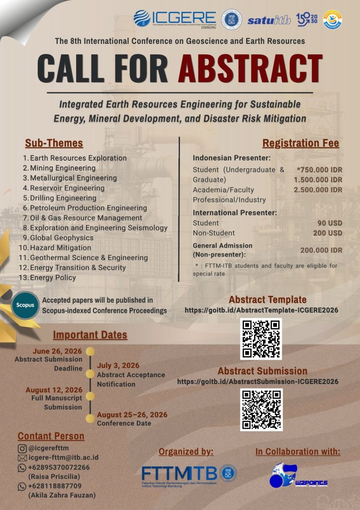 The 8th International Conference on Geoscience and Earth Resources Engineering (ICGERE) is organized by Faculty of Mining and Petroleum Engineering, Institut Teknologi Bandung. Our theme is “Integrated Earth Resources Engineering for Sustainable Energy, Mineral Development, and Disaster Risk Mitigation“. The conference will be held in hybrid format. Accepted papers will be published in Scopus-indexed Conference Proceedings.